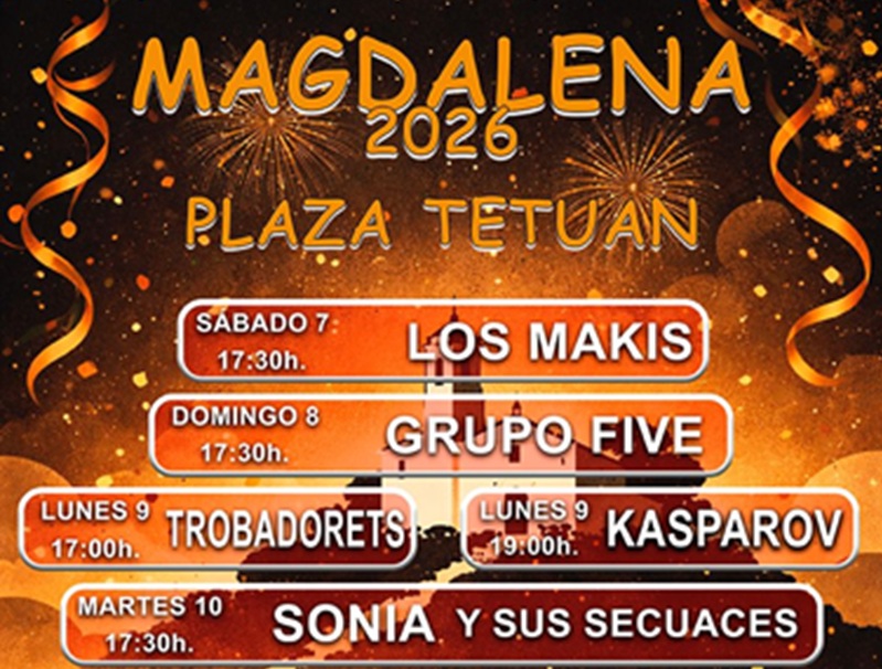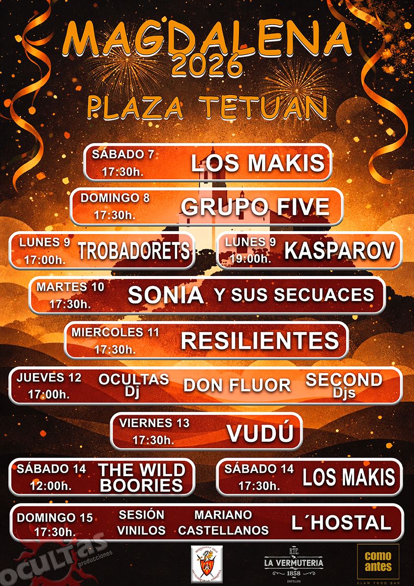 Ya no queda nada para que empiece las fiestas de la Magdalena 2026, que tendrá lugar del 7 al 15 de marzo y, como es habitual, hemos preparado un programa de actuaciones para que podáis disfrutar de la música en la Plaza Tetúan. Este es el calendario de p-tardeo para la Magdalena 2026. Una propuesta musical variada en estilos y formatos para que disfrutéis de la música algo que, por otra parte, sabéis que, desde siempre, está muy asociado a la propuesta de como antes que no es otra que: buenos amigos, buena comida y buena música. Sábado 7; Los Makis (17:30hr), Domingo 8; Vanhoren Band (17:30hr), Lunes 9 Trobadorets y Kasparov 19:00hr, Martes 10 Sonia y sus secuaces (17:30hr), Miércoles 11 Resilientes Rock Band (17:30hr), Jueves 12 Ocultas Dj Don Fluor y Second Djs (17:30hr), Viernes 13 Vudú (17:30hr), Sábado 14 The wild borries (12:00hr) y Los  Makis (17:30hr) y Domingo 15 Sesión vinilos Mariano Castellanos L´Hostal (17:30hr)